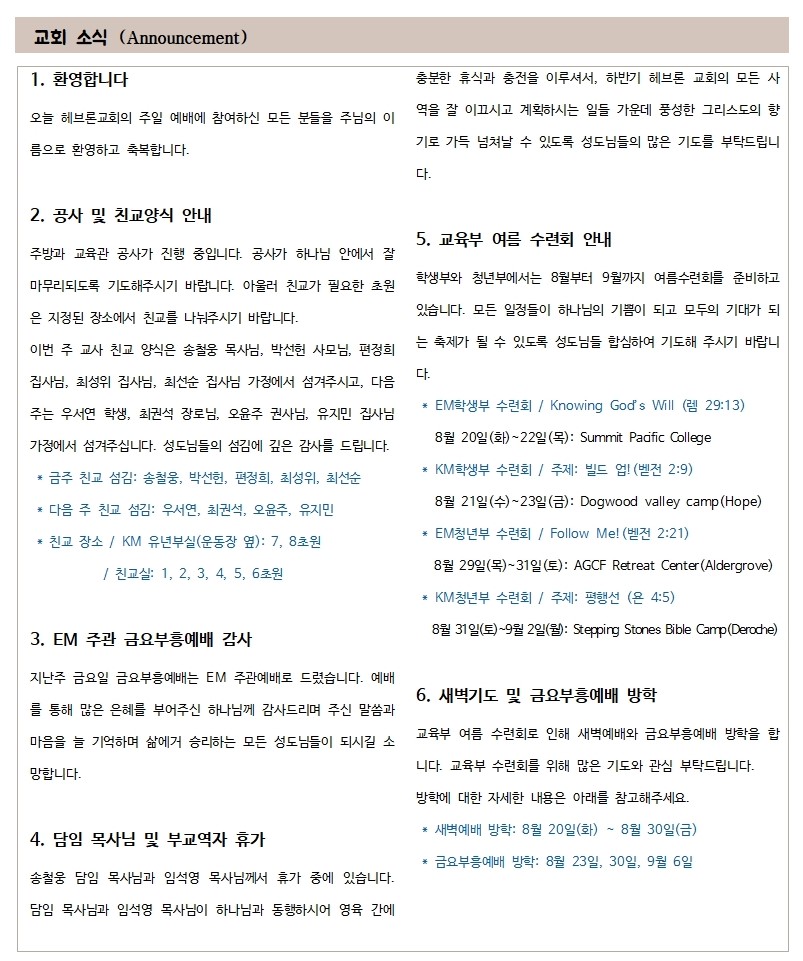 2024년 8월 18일 교회소식