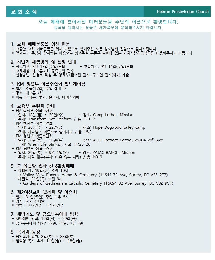 2025년 8월 17일 교회소식
